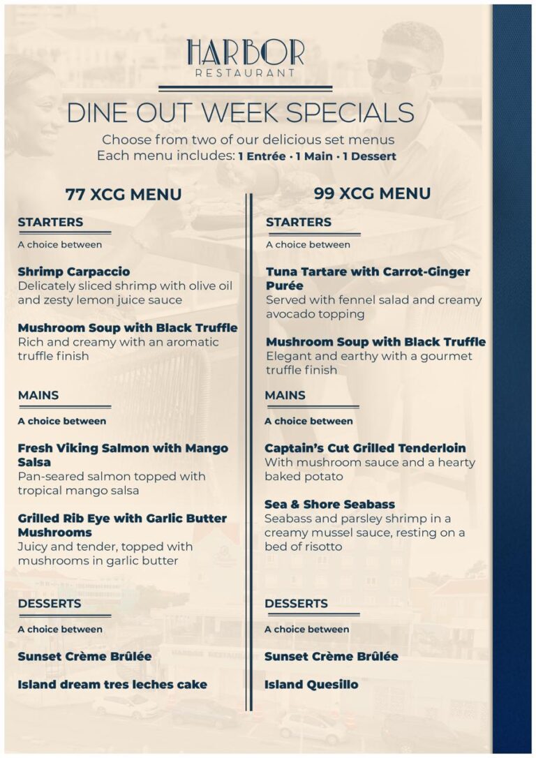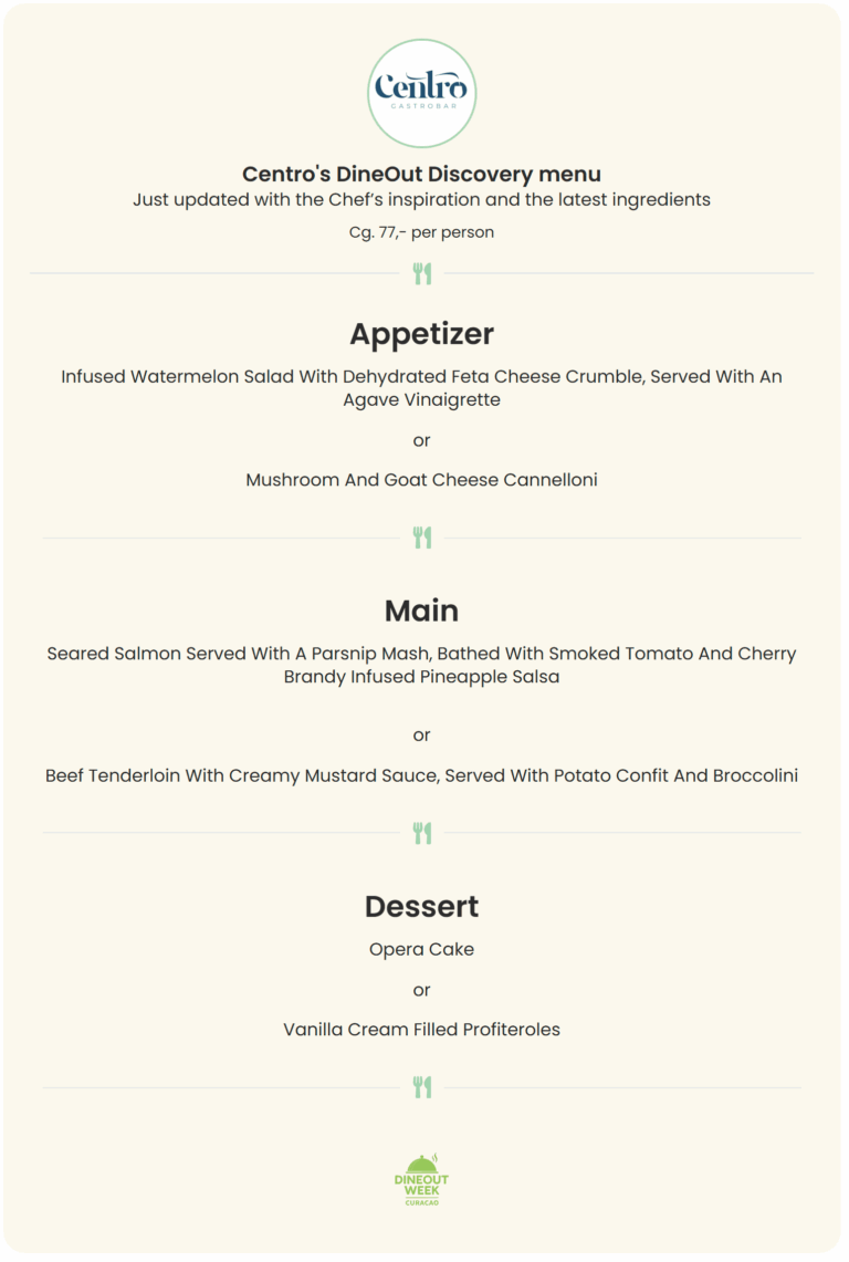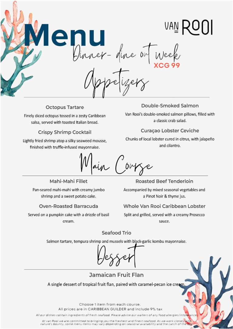 During Curaçao DineOut Week participating restaurants offer special Dinner menus at prices of Cg 77 / Cg 99 / Cg 122 and Lunch for only Cg 55 / Cg 66 / Cg 77