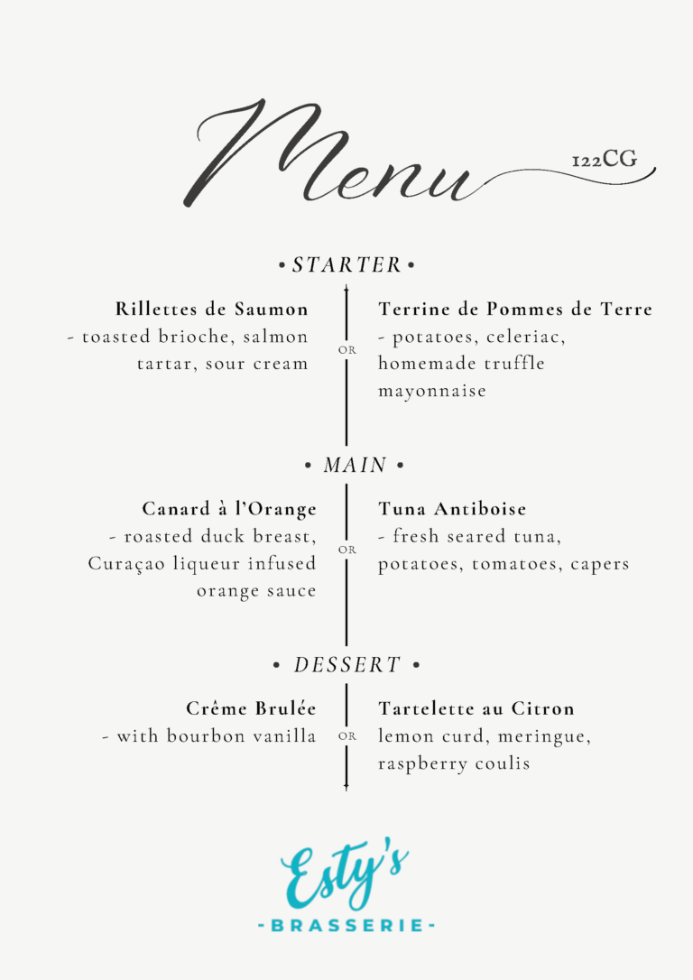 Some menus may include optional upgrades or alternative dishes for a small surcharge.