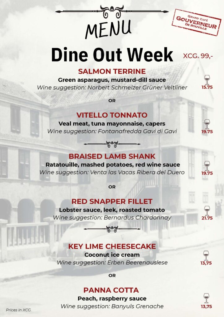 During Curaçao DineOut Week participating restaurants offer special Dinner menus at prices of Cg 77 / Cg 99 / Cg 122 and Lunch for only Cg 55 / Cg 66 / Cg 77