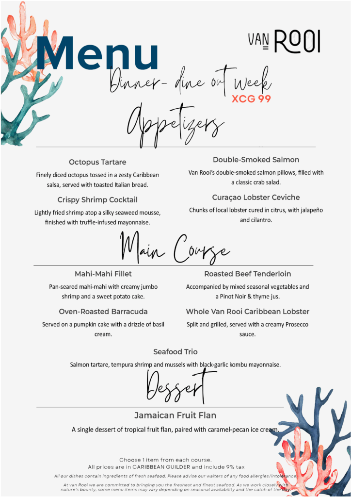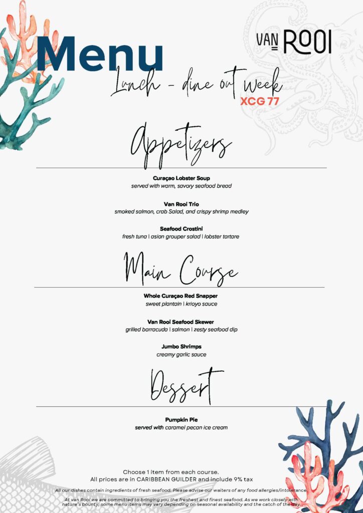 During Curaçao DineOut Week participating restaurants offer special Dinner menus at prices of Cg 77 / Cg 99 / Cg 122 and Lunch for only Cg 55 / Cg 66 / Cg 77
